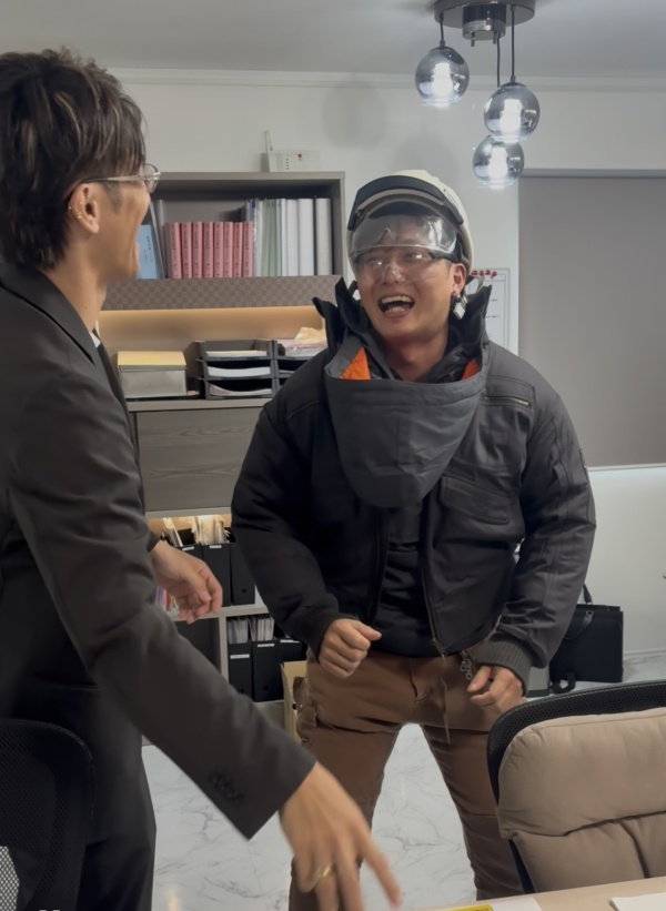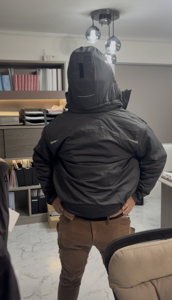 フードの下には保護メガネ×2+ヘルメット。